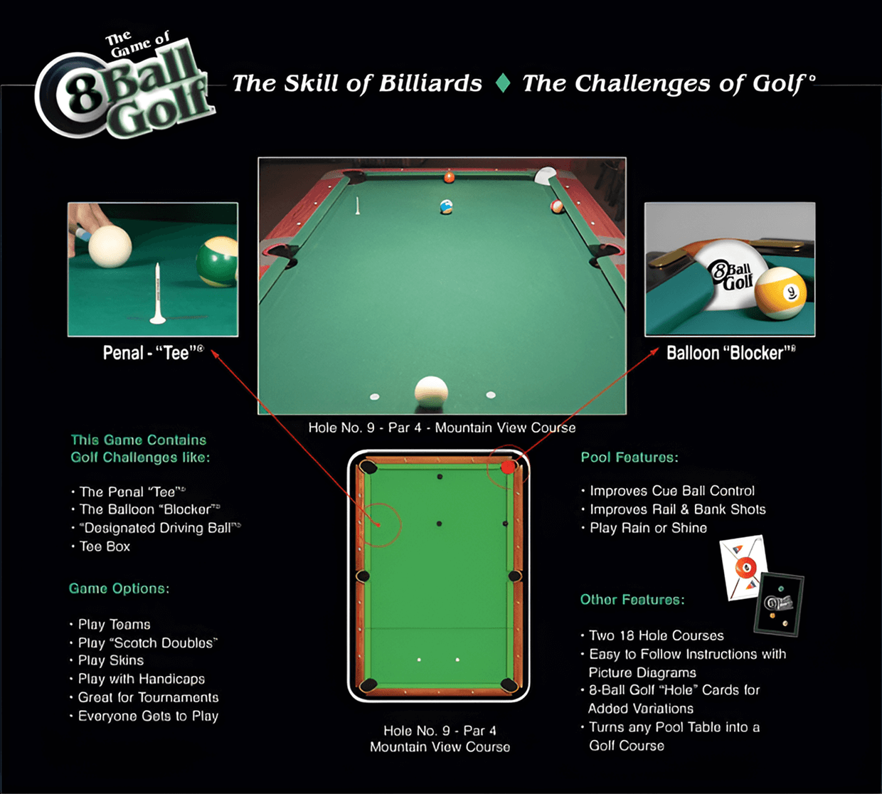 Transform your standard pool table into a professional-grade golf course. Whether you’re a pool shark or a weekend golfer, 8-Ball Golf offers a unique, challenging experience for players of all skill levels. Experience the essence of a golf round with your friends, right in your game room.